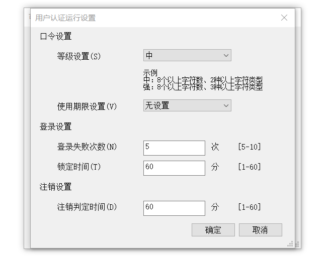 1.等級設(shè)置:可以規(guī)定口令的強度等級。(中:2種字符;強:3 種字符)