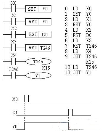 1 ) SET 指令的目標元件為 Y、M、S , RST 指令的目標元件為 Y、M、S、T、C、D、V、Z 。 RST 指令常被用來對 D、Z、V 的內容清零,還可以用來復位積算定時器和計數器。