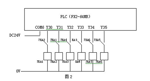 變頻器1﹑2﹑3分別控制電機M13﹑M14﹑M15,主回路接線圖略。PLC為FX2-64MR。FMA﹑11是來自灌裝機變頻器0~10V的輸出信號,經過信號隔離器的轉換作為變頻器1﹑2﹑3的控制信號。圖中KA1-6為輔助繼電器。W1-6為分壓電位器。PLC的輸入端子略。FMA﹑11是來自灌裝機主機變頻器的輸出信號。兩圖中的PLC為同一PLC,圖2中的COM6接DC24V電壓,控制輔助繼電器。