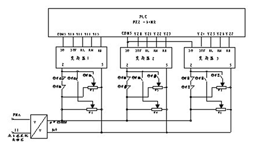深圳某啤酒生產廠使用三菱變頻器FR-A540E為主要核心設備對該廠灌裝生產線輸瓶帶的調速要求進行部署。三菱變頻器外部端子調速可分為模擬量調速和多段速調速。模擬量調速可用電壓DC0~10V或電流DC4~20mA,進行無級調速。我廠用0~10V模擬電壓作為給定量 ,進行開環調速 ;多段速采用外部輸入端子 SD﹑STF﹑RL﹑ RM﹑RH,進行三段速調速。RL﹑RM﹑RH是低﹑中﹑高三段速速度選擇端子,SD是輸入公共端,STF是啟動正轉信號。如圖3中,當Y10,Y11有輸出時,變頻器為低速運行;當Y10,Y12有輸出時,為中速運行;當Y10,Y13有輸出時為高速運行。變頻器2﹑3原理與此相同。三段速分別設置為15Hz﹑30Hz﹑45Hz。在模擬量調速時,通過調整W1﹑W2的分壓比設置KA1閉合時變頻器高速運行,KA2閉合時為低速運行,當KA1﹑KA2都斷開時,變頻器為最高速;變頻器2﹑3原理與此相同。通過編程,PLC根據操作臺發出的信號,選擇控制方式:模擬量調速或多段速調速。三菱變頻器的多段速調速比模擬量調速有較高優先級(1)。