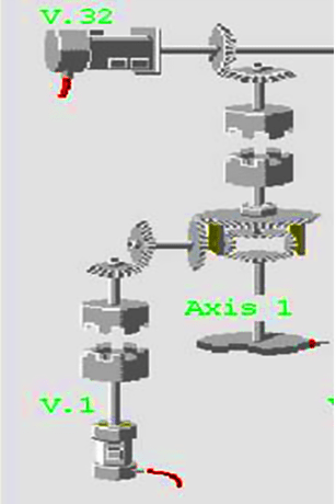 變速機(jī)控制和差速齒輪法既可離線設(shè)置也可在線調(diào)節(jié) 。連接變速機(jī)到滾筒支路,把變速機(jī)的變速比設(shè)為變量,通過調(diào)節(jié)各輥的變速比值,使其達(dá)到線速度相等。 連接差速齒輪到滾筒支路,在差速齒輪側(cè)加入輔助虛擬伺服電機(jī)使輥筒的速度得到修正 。