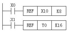 (1)輸入輸出刷新指令REF REF(P)指令的編號為FNC50。三菱FX系列plc采用集中輸入輸出的方式。如果需要最新的輸入信息以及希望立即輸出結果則必須使用該指令。如圖1所示,當X0接通時,X10~X17共8點將被刷新;當X1接通時,則Y0~Y7、Y10~Y17、共16點輸出將被刷新。