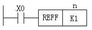 (2)濾波調整指令REFF REFF(P)指令的編號為FNC51。在FX系列PLC中X0~X17使用了數字濾波器,用REFF指令可調節其濾波時間,范圍為0~60ms(實際上由于輸入端有RL濾波,所以最小濾波時間為50μs)。如圖2所示,當X0接通時,執行REFF指令,濾波時間常數被設定為1ms。
