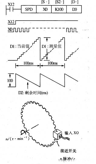 速度檢測指令SPD的編號為FNC56。它的功能是用來檢測給定時間內從編碼器輸入的脈沖個數,并計算出速度。如圖5所示,[D. ]占三個目標元件。當X12為ON時,用D1對X0的輸入上升沿計數,100ms后計數結果送入D0,D1復位,D1重新開始對X0計數。D2在計數結束后計算剩余時間。