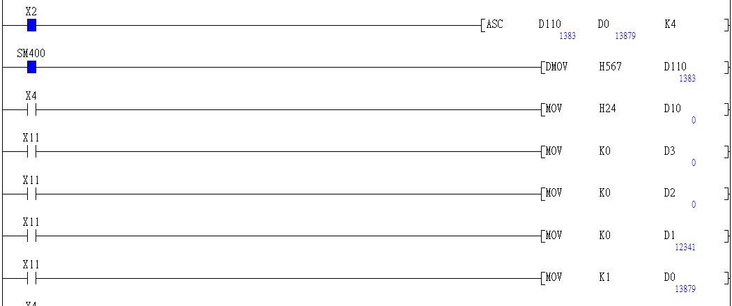 ASC指令:只處理16進制數,如圖D110=H567,6和7分別轉換成ASC值00110110 00110111當做二進制存儲在D0中,0011011000110111=13879