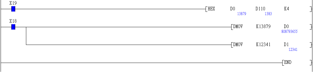 HEX指令:與ASC指令正好相反,K4同樣表示轉換幾個字符串,D0=K13879先轉換為二進制