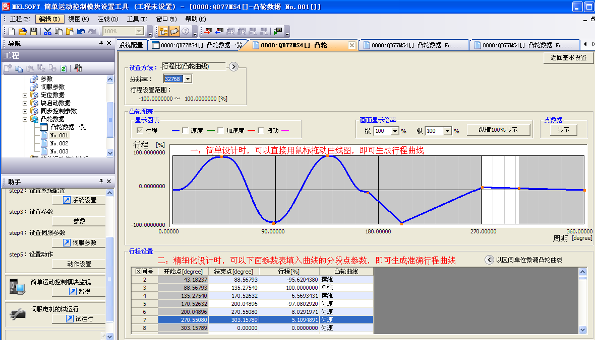 5、凸輪曲線功能強大,設計簡單,可以直接用鼠標拖動曲線圖,即可生產行程曲線,而精細設計時,可以通過填曲線轉折點的行程參數自動生成曲線。電子凸輪的軟件設計上分辨率極高,如圖X軸是凸輪的運行周期(分辨率36000000度),Y軸是行程(分辨率1000000000%),實現高精度的運動控制。