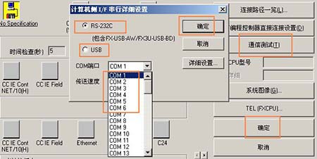 編程電纜插傳統的圓孔時,連接目標設置選擇 RS-232C,并且要選擇相應的 COM 口編程電纜插迷你 USB 口時,連接目標設置選擇 USB。