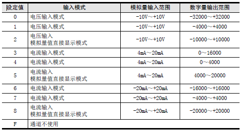請根據連接的模擬量發生器的規格,設定與之相符的各通道的輸入模式(BFM #0)。用16進制數設定輸入模式。請在使用通道的相應位中,選擇下表的輸入模式,進行設定。