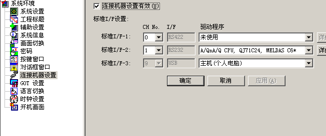 1、使用三菱PLC電纜QC30R2通過RS232方式與PLC通訊,PLC端不用做任何設置。而三菱觸摸屏GT11系列如下圖所示: