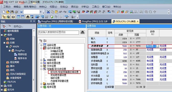 首先在三菱PLC軟件GX Works3中新建一個(gè)工程,然后在導(dǎo)航樹狀欄中依次點(diǎn)擊選擇以下欄目內(nèi)容:【參數(shù)】-【FX5UCPU】-【CPU參數(shù)】-【存儲(chǔ)器/軟元件設(shè)置】-【軟元件/標(biāo)簽存儲(chǔ)器區(qū)域設(shè)置】-【內(nèi)部繼電器】-【有設(shè)置】-編輯修改軟元件M和D的鎖存起始和結(jié)束范圍。