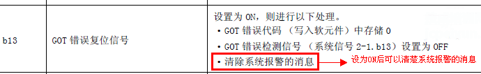 系統信號1-1中每一位都有其相應的意思,詳情請參看三菱觸摸屏手冊公共篇中系統信息內容說明中的介紹,在這里面我們需要清除這些報警信息,必須把D0中的b13位置為ON,b13位的作用如下圖所示。