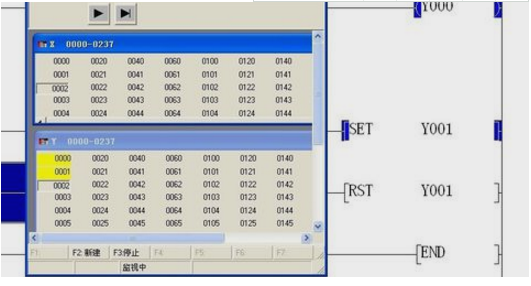 七、在監(jiān)控對(duì)話框中調(diào)出X和Y監(jiān)控頁(yè)面,點(diǎn)擊軟元件—位軟元件窗口。這時(shí)可以點(diǎn)擊X0和X2,雙擊兩次X0相當(dāng)于按鈕功能,這時(shí)發(fā)現(xiàn)Y0已經(jīng)保持輸出狀態(tài),再次按X1解除。按下X2會(huì)使Y1保持輸出,按下X3才能復(fù)位Y1。
