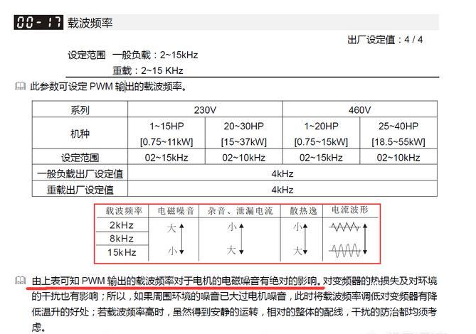載波頻率是變頻器內部導通開關管的PWM(脈沖寬度調制)頻率,它對電機的電磁噪聲有絕對的影響;