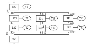 按照匯合狀態的編程方法,依次將 S21、S31、S32、S41、S42的輸出進行處理,然后按順序進行從 S22(第一分支)、S32(第二分支)、S42(第三分支)向S50的轉移。